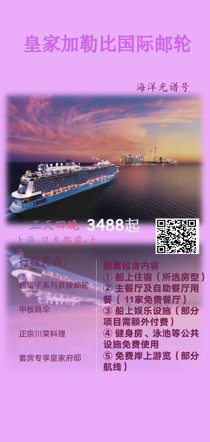 今天迎来全天的邮轮海上巡游,让轻松舒适来开启您的邮轮之旅。您可以根据自己的喜好,享受船上的休闲娱乐设施及各式美食,体验丰富多彩的娱乐项目。
